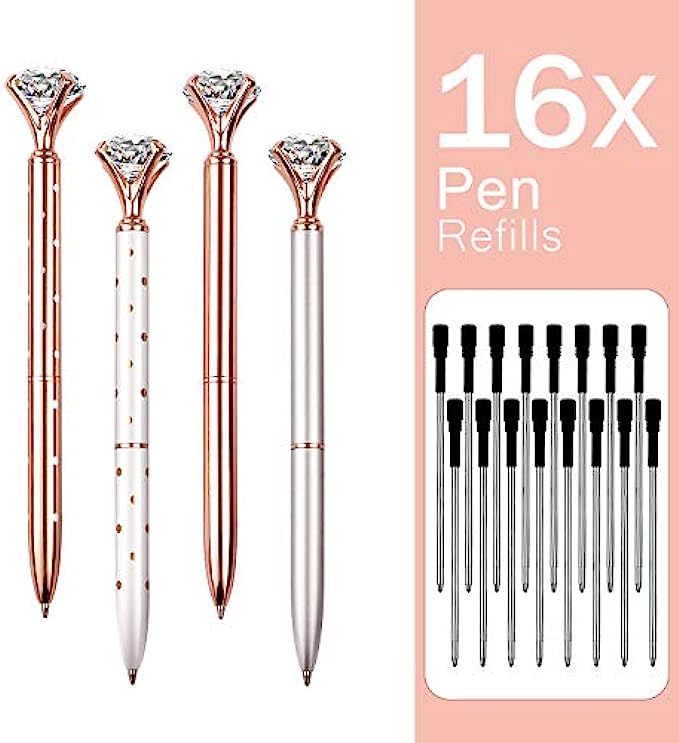16 pieces diamond pens in different colors, silvery, rose gold, rose gold decorated with white dots, white decorated with rose gold dots, black inks refill.