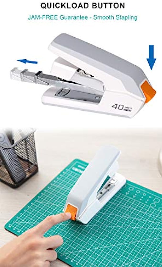 • [40 Sheet Capacity] – 2x more than standard staplers, perfect for desktop use at work office, home, or in the classroom. You can use the stapler immediately out of the box with 1000 1/4 inch leg standard size staples and and 500 5/16 inch leg large staples