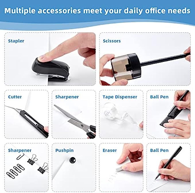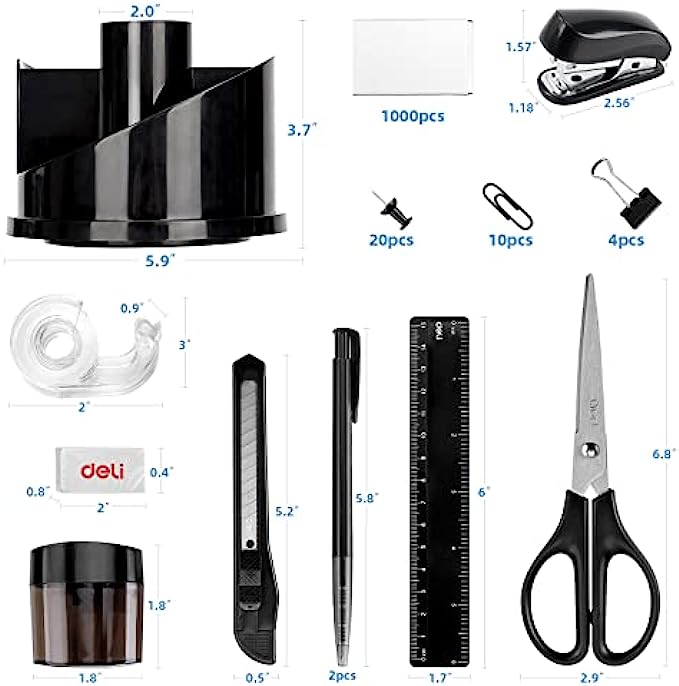 【WHAT YOU GET】The desk supplies set come with 1x rotating multi-functional pen holder, 1x Stapler, 1000x Staples, 1x Tape dispenser, 1x 15cm Ruler, 10x Push Pins, 2x Ball Pens, 1x Sharpener, 1x Scissors, 1x Eraser, 1x Tape, 4x Binder Clips, 1x Small Cutter, 20x Paper Clips