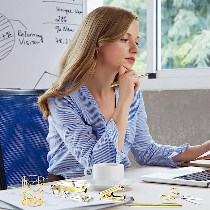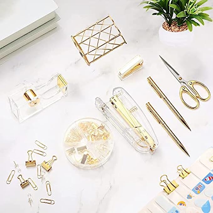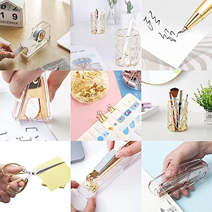 • Packing Listing: 1x stapler, 1x staple remover, 1000 x staples, 1 x tape holder, 1 x pen holder, 2 x pens, 1 xscissors and 1 x box of binder clips; This gold office supplies set can meet your needs in daily life and work, keeping your desk or desk drawer organized.