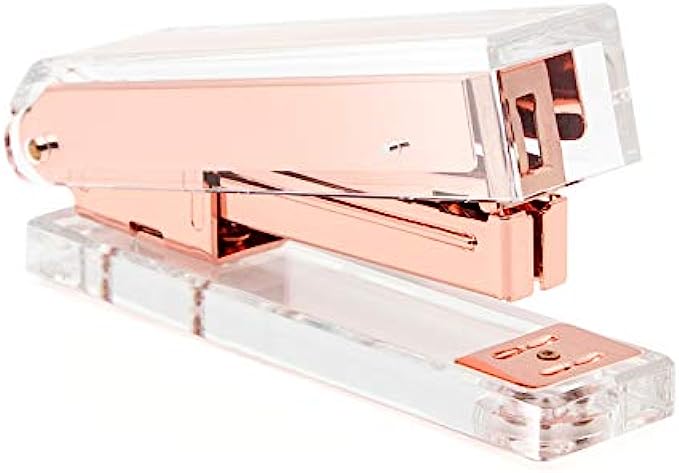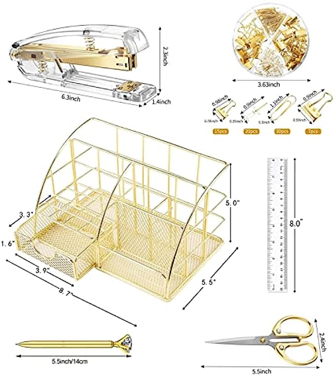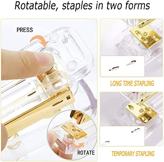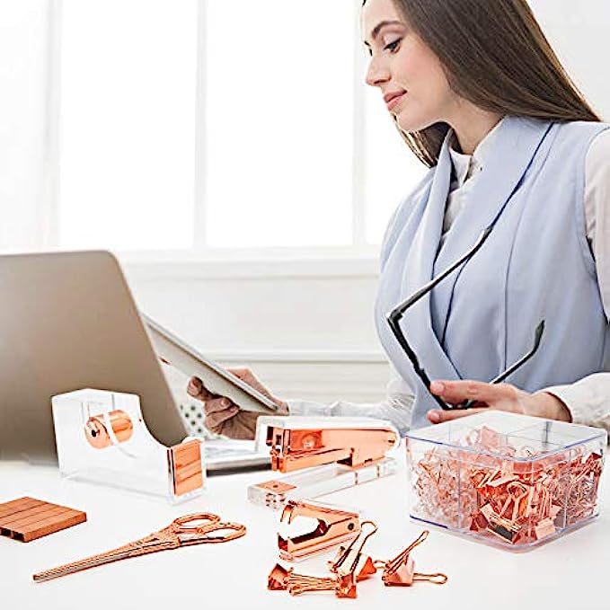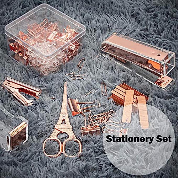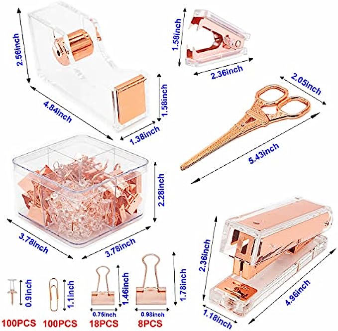 【Package includes】:1xStapler,1xTape Dispenser,1xStaple Remover,1xScissors,26pcs Binder Clips,100pcs Paper Clips,100pcs Push Pins and 1000pcs staples(all Rosegold)