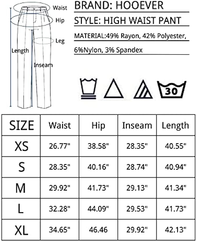 49% Rayon, 42% Polyester, 6% Nylon, 3% Spandex Imported Button closure Drape design, straight pattern Front button and back elastic, suitable for all shapes and sizes Fashion comfy solid high waist long pants, beach button down pants Suitable for any seasons date office school travel hiking and home Attention: The pants are more flowy drape and skin-friendly after washing, and the color may be slightly different due to the shooting light problem
