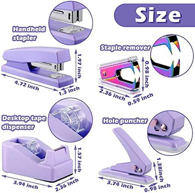 • Package Includes: 1 x handheld stapler, 1 x desktop tape dispenser, 1 x hole puncher, 1000 x staples, 1 x staple remover, 1 x ballpoint pen, 74 x binder clips and paper clips, 20 x push pins, 1 x scissor, 1 x letter opener, such a complete combination is enough to meet your school and office using needs
