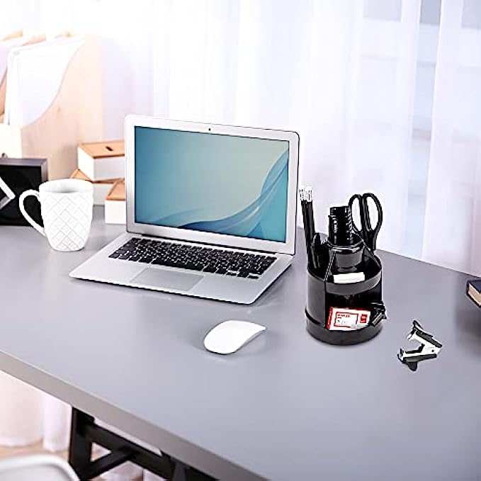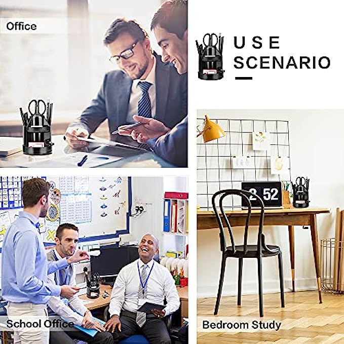• Comes with:1x Rotating desk organizer, 1x stapler, 1 x staple remover, 1x scissors, 1 x Sharpener, 1 x small cutter, 1 x ruler, 1 x eraser, 1 x ball pens, 2 x HB pencils, 4 x binder clips, 10 x push pins, 20 x paper clips, 1000 x staples.