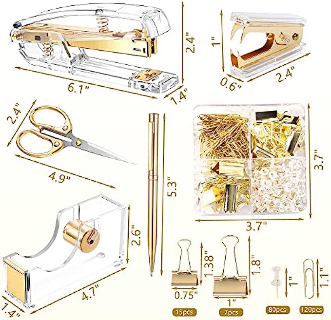 【Size】Stapler: 6.1*2.4*1.4 inches. Tape dispenser: 4.7*2.6*1.4 inches. Staple remover: 2.4*1*0.6 inches. Scissors: 4.9*2.4 inches. Ballpoint Pen: 5.3 inches long. These can be put in the drawer at will without taking up space. Clips are equipped with a lattice storage box for easy storage.