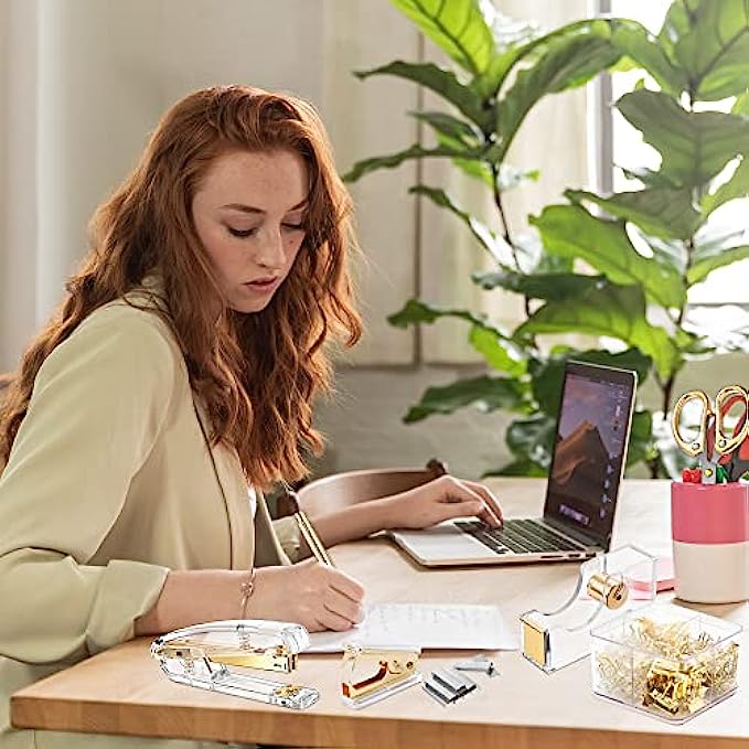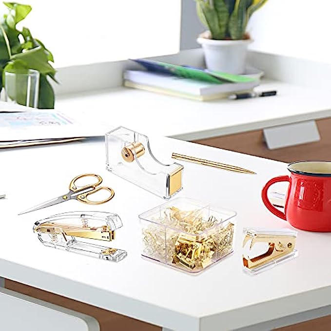 【Material】Stapler, Tape Dispenser and Stapler Remover are mainly made of acrylic and metal, smooth and comfortable to the touch, not easy to break, durable. The color is clear and bright, elegant and beautiful, very suitable for desktop office supplies.