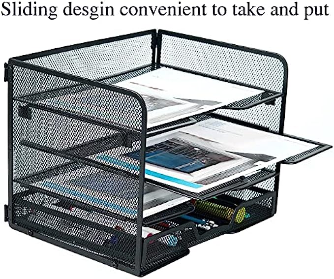 SETTFRFE 4-Tier Mesh Paper Letter Tray,Desk File Organizer with a Sliding Drawer,Office Supplies Desk Organizer for Home Office,Black.