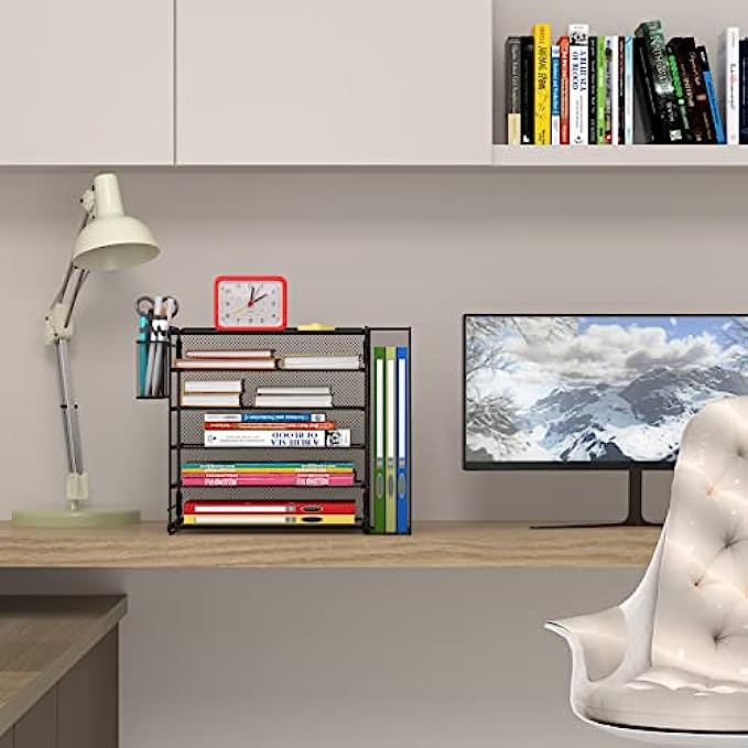 • Unique 5+1+1 Shelves Design: 5 Tier sliding trays are perfect for storage all your A4/letter sized papers and file folders, 1 vertical magazine rack is ideal for place your other books and magazines, 1 pen holder is ideal for organize all your pen and pencils.