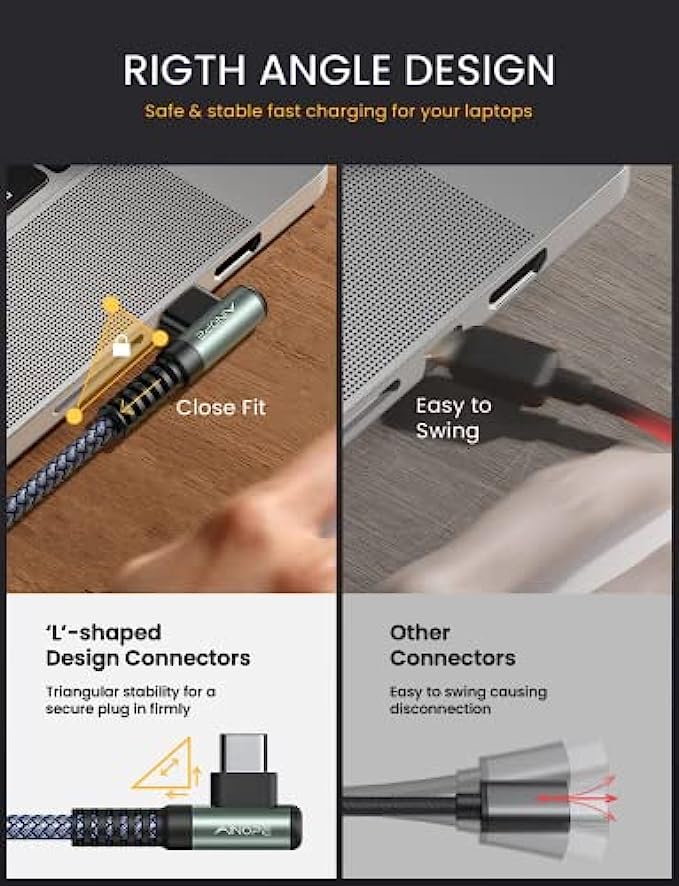 ?"L" Connector Design, Prevent Bending & Breaking: This right angle type c to type c cable fast charge with an innovative 90 degrees "L" design. It's more convenient and comfortable for playing games, watching videos, reading e-books when you charging. A comfortable grip brings you an immersive operating experience, It completely solves the troubles of ordinary wires that are easy to block hand, unintentionally interrupted and the bending of the connector while using while chargin.