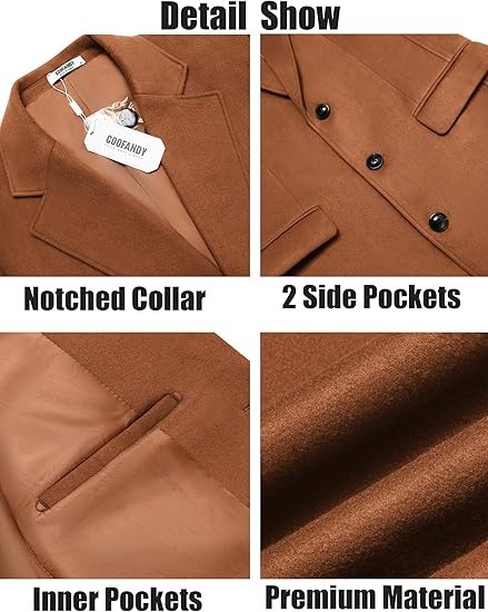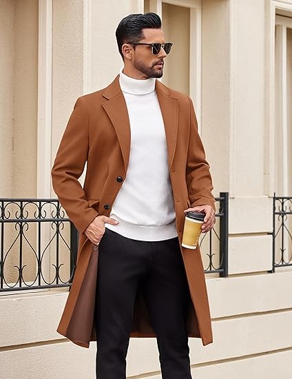 COOFANDY Mens Trench Coat Long Casual Single Brested Overcoat Winter Notched Collar Wool Blend Pea coat With Pockets